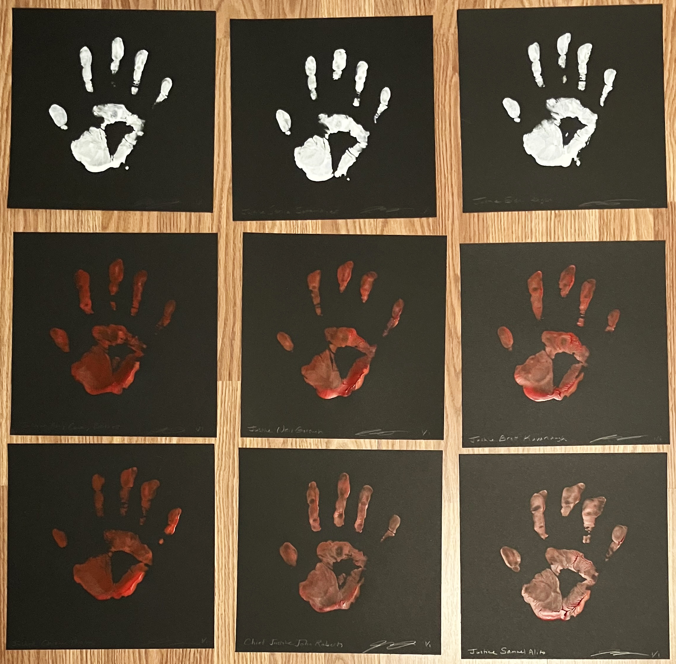 hand monoprint on paper; nine, each 10×10″ (in white for Justices Stephen Breyer, Elena Kagen, Sonia Sotomayor, and in red for Justices John Roberts, Samuel Alito, Clarence Thomas, Neil Gorsuch, Brett Kavanaugh, Amy Coney Barrett)