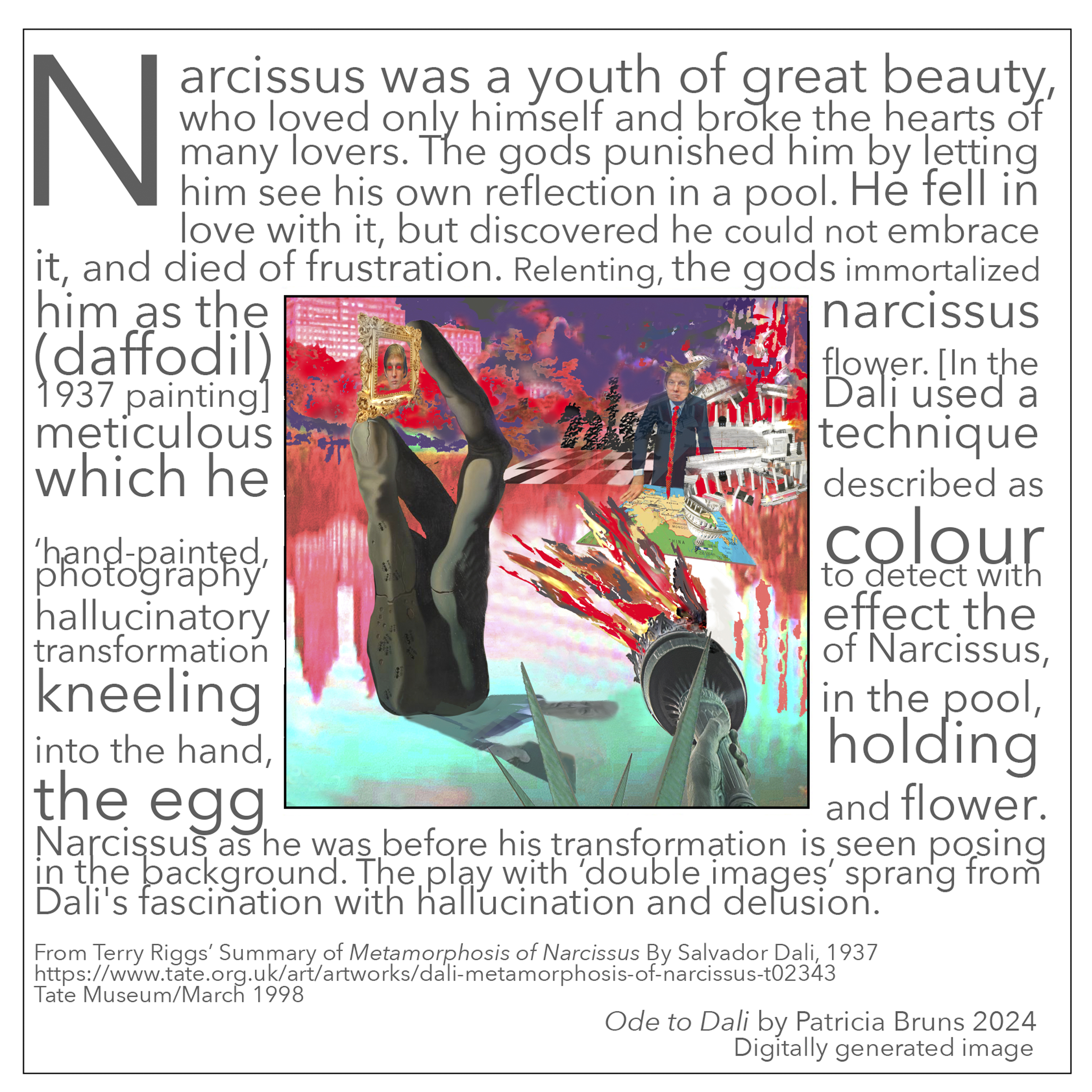 “Since 2020, I have felt as if I am living a Surrealist painting. Turning to Dali, I sought inspiration about a world turned upside-down and distorted beyond my beliefs. I stumbled upon Metamorphosis of Narcissus,1937 and reinterpreted the Greek myth. My dreamscape is New York’s Central Park. The chess king and his knights disintegrate. A young man ponders a map of the world as democracy crumbles. Staring out with hollow eyes, this Narcissus remains framed in his gilded past. The diminished image of a man lies in the swirl of water below as Lady Liberty’s torch rages over the pathos. Redemptions remain elusive.”