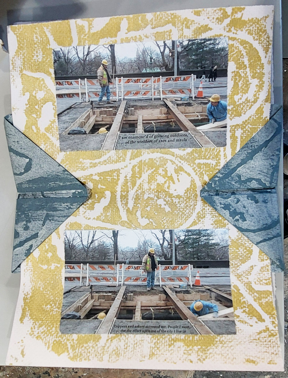 digital photographs collaged with relief prints and altered New York City maps crown structure. Quotations from Leaves of Grass; 6.5×9.75×0.5”