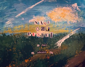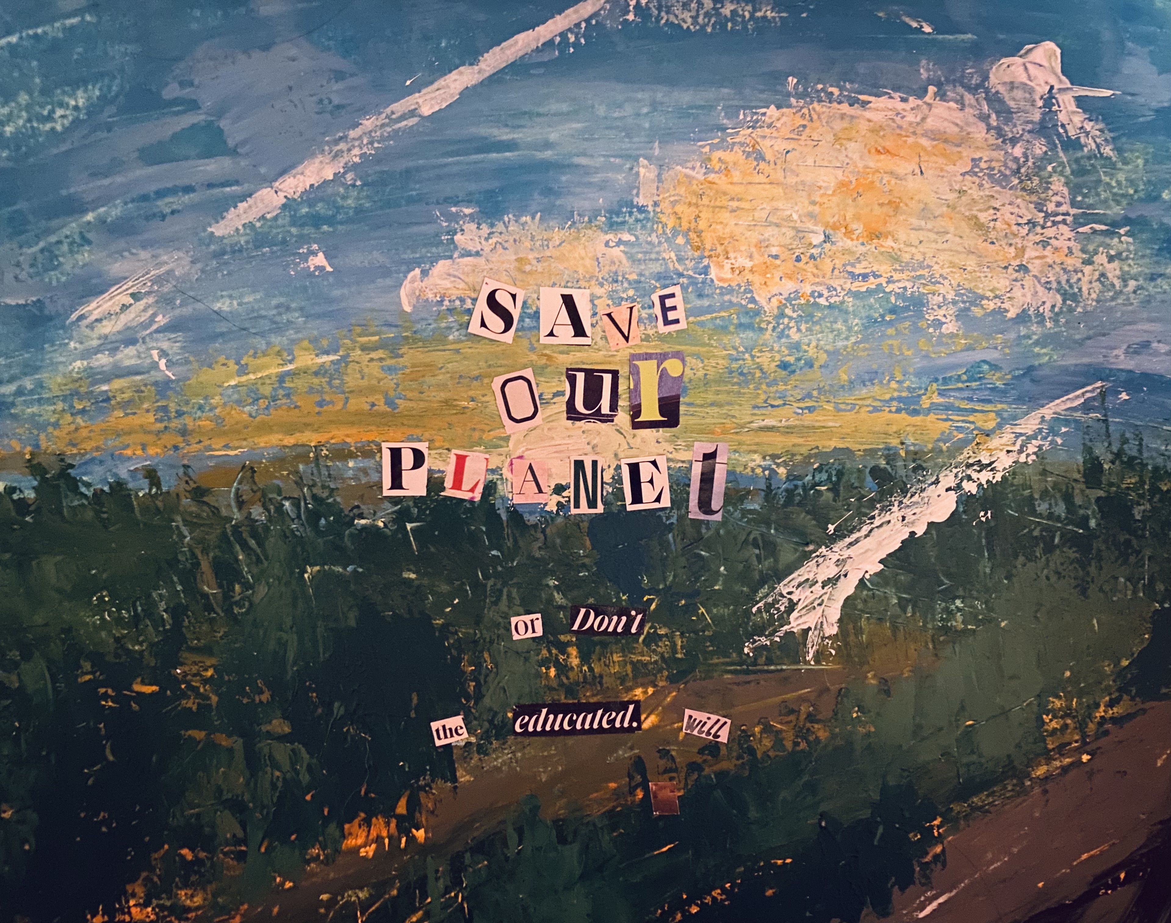 “Depiction of a ransom letter/PSA using magazine lettering behind a pallet knife painting of a forest.”