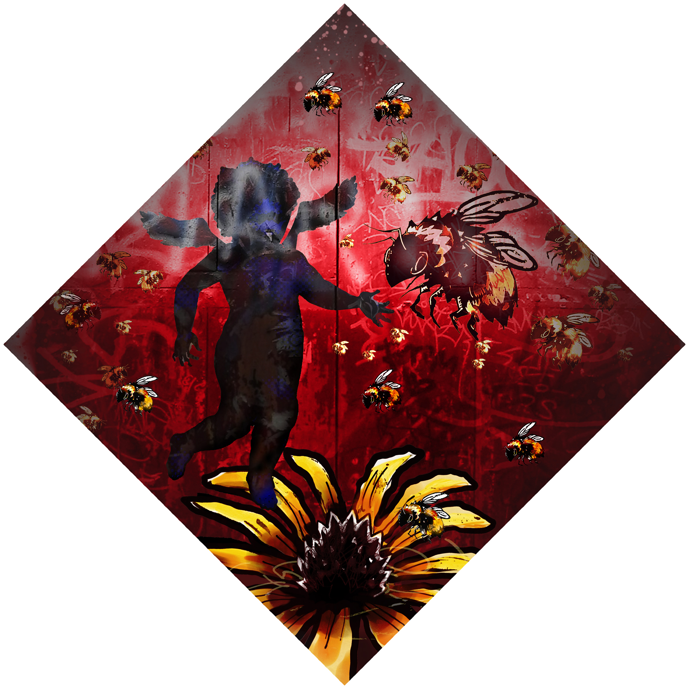 “A cherub encounters a swarm of bees above a black-eyed Susan, a symbol of judgement.”