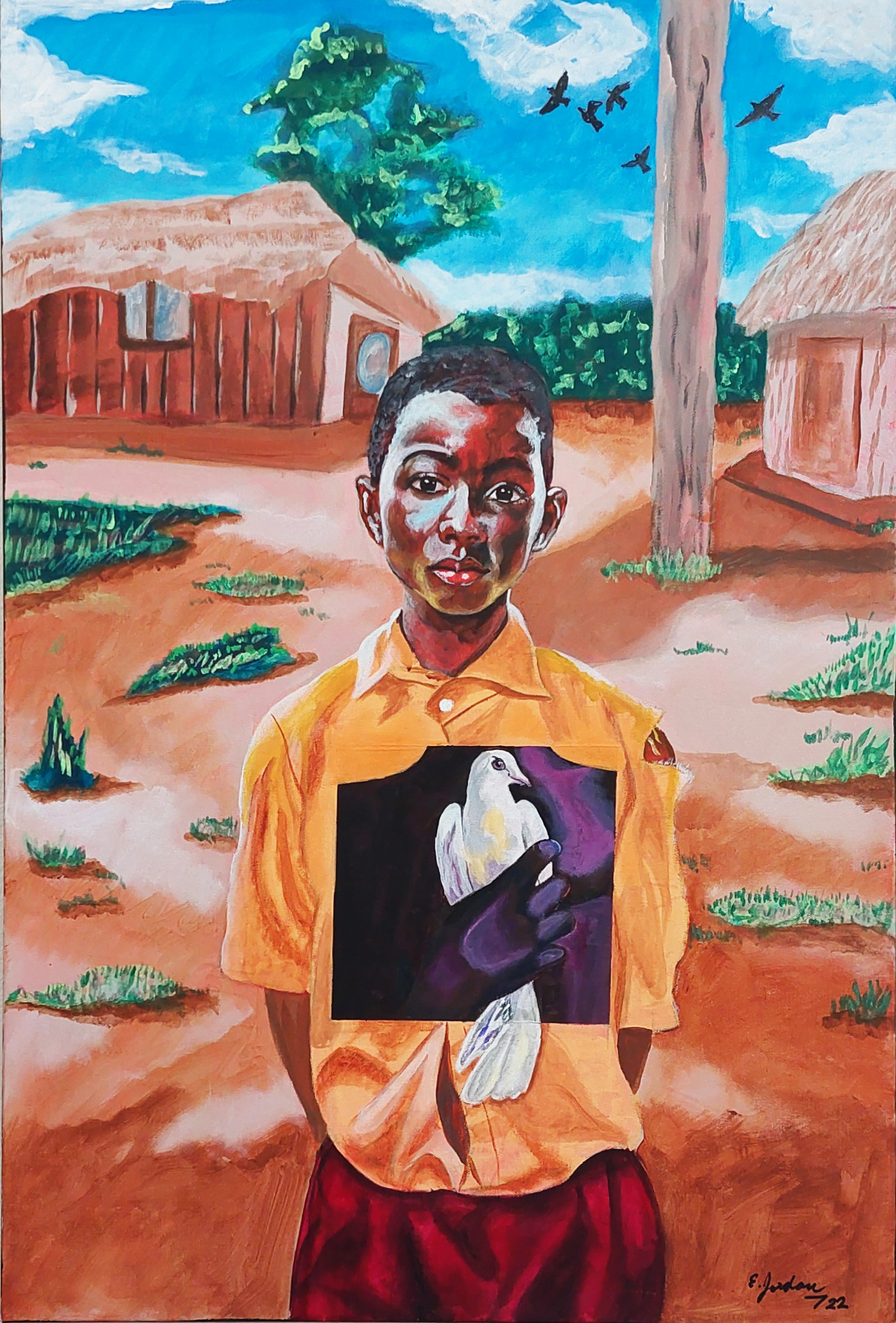 “This young man looks like many of the school boys I have met in Ghana. I look at him as my young brother who like me, is often seen as a threat but has a peaceful loving soul. The dove depicts innocence and spirituality.”