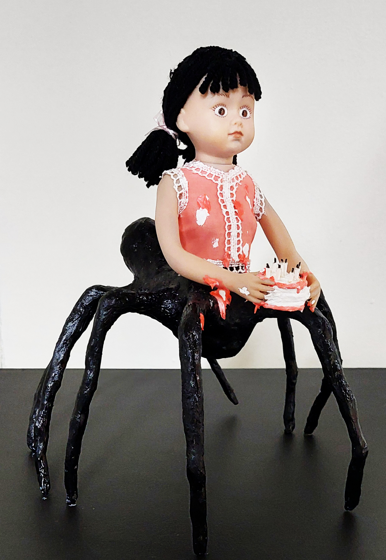 found doll parts, clay, silicone, handmade garment, yarn, & ribbon; 11x8x9”