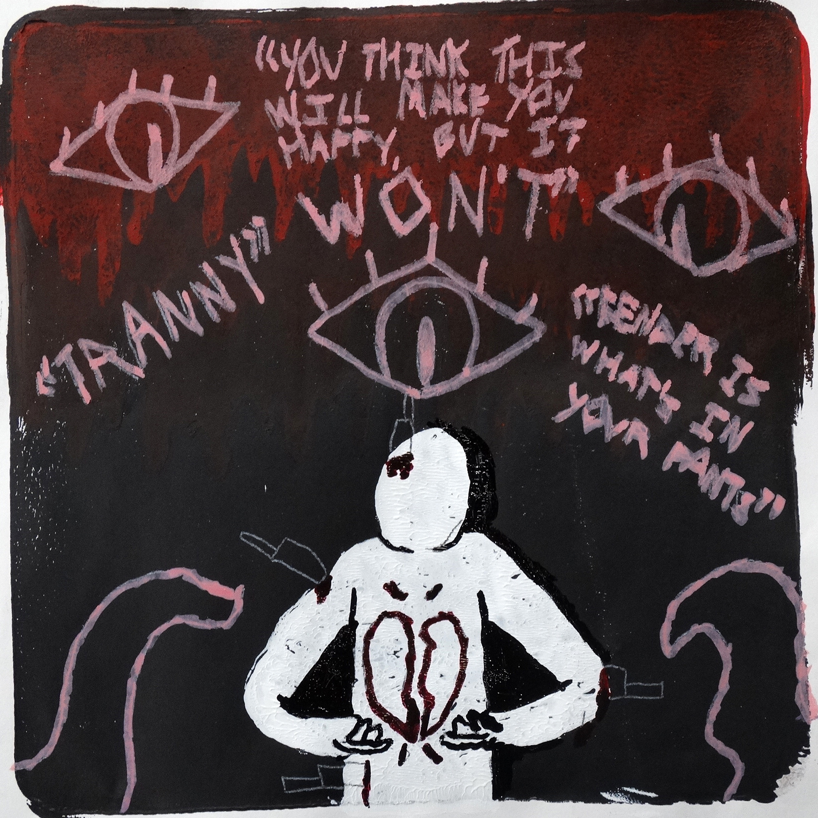 “My artwork is about Article 19 of the Universal Declaration of Human Rights, which is the freedom of opinion and expression. I wanted to show the struggle of discrimination and fear that people of the LGBTQ+ community and those who want to freely express their gender feel. I included multiple quotes that contain frequent harmful messages towards people who are trans, or sometimes just some other gender identity such as non-binary or genderfluid, along with eyes watching them with tentacles that are shoving knives into them, and a heart in the middle that is cracking. Discrimination from the outside takes a toll and breaks down who we really are, trying to force us to conform with what others in society want for us rather than what we want. Not only does the creature(s) in the background represent discrimination, but it also represents fear, and how because of cases of discrimination, people tend to stay closeted and conform to society’s expectations out of fear that the same will happen to them if they try to express themselves openly, and how fear can also break down what really lies within our hearts and soul.”