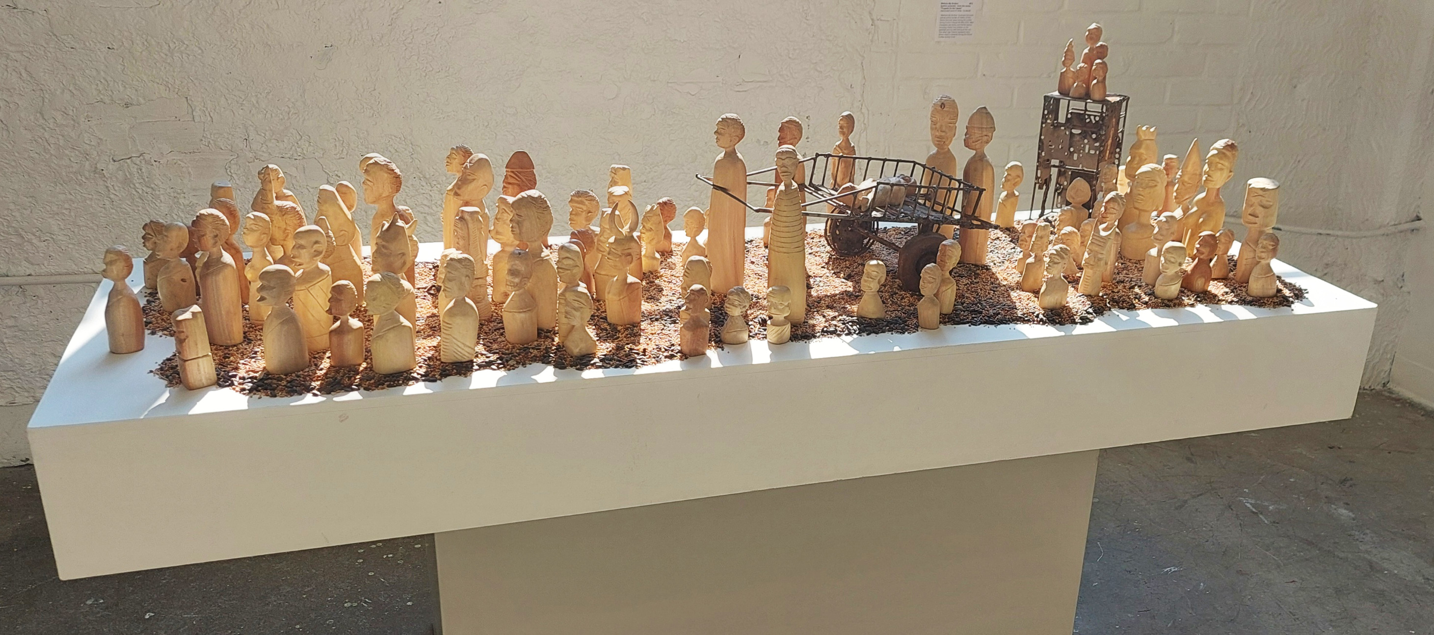 “‘Mathare My Brother’ illustrates the extra judicial police murder of Vitallis Ochillo Owino that took place during the curfew during Covid in Kenya 4th May 2020. Main characters are family and friends totems, including Vitallis’ five children on the pedestal and his wife looking at the cart. The other Vigil Totems represent many others killed or disabled during the Kenya Curfew during Covid.”
