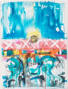 “In my paintings in water-media, there is no preconceived subject matter. Any narrative aspects come about as part of the process of painting. As the helmet forms came through, I saw the heads of soldiers and imagined that the painting might be a commentary about the absurdity of maintaining peace through inflicting death and destruction.”