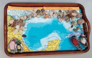 shells, string, laminated map of the Gulf, wooden spools, tray; 12x24x3″