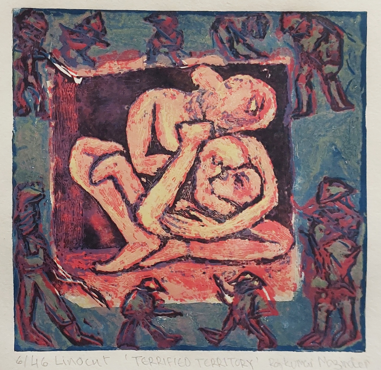 My linocut print, “Terrified Territory,” portrays the social violence and injustice faced by the weaker sections of society, symbolised by a mother and child. Through my artistic process, I have attempted to capture both local and global ethos, reflecting on our heritage while confronting the harsh realities of the present. The uncertainty in my technique echoes my desire for innovation and the search for new artistic expression.