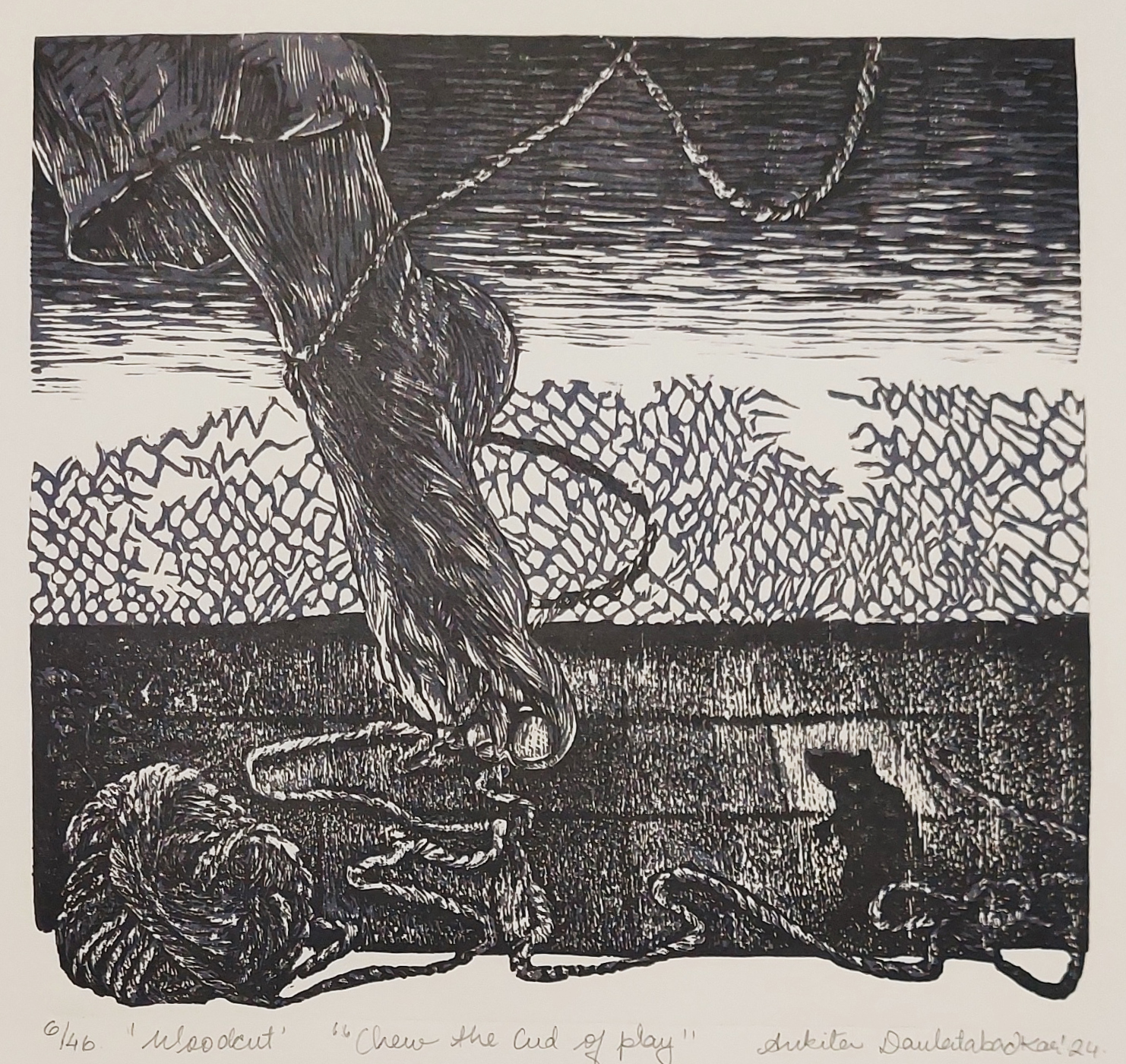 Exploring the tapestry of self and society, this woodcut print strikes with unrelenting force, offering an unforgiving critique of deep-rooted social injustices. At its core, a worn and intricately detailed leg symbolizes the ceaseless grind endured by society’s workaholics. Swarming around, rats scurry and gnaw; they represent the mischievous and often cruel aspects of human behaviour.