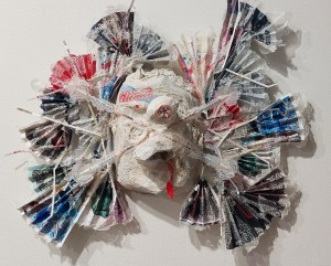 all re-purposed materials: papier maché, other paper, including from my artist-parents’ “collections”, plastic food container, other plastic, band-aids, fishing lure; 21x24x8”