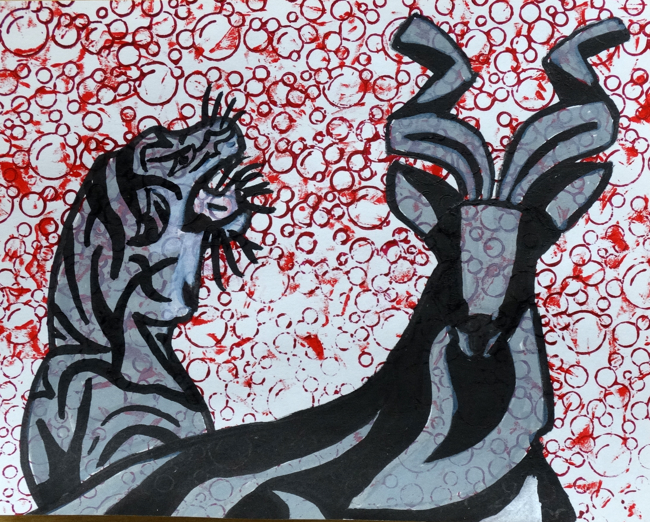“For a long time there have been tensions between the nations of India and Pakistan over a contested piece of land. My print shows the violence between the two nations, with the tiger, national animal of India, in a very aggressive stance turned on the markhor, national animal of Pakistan. The red in the background is for blood.”