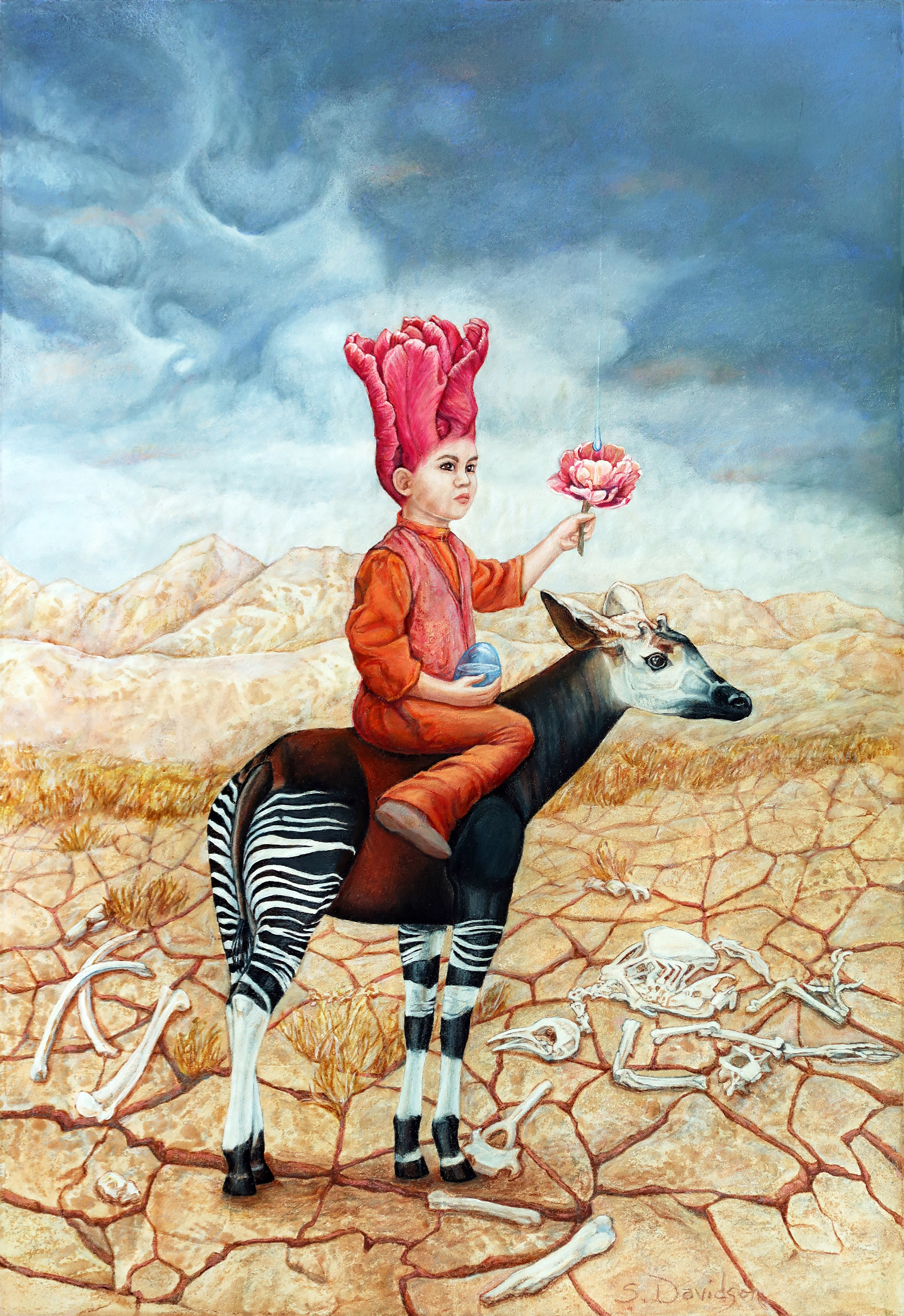 “This piece addresses the climate change crisis through fantasy/surreal imagery. In a bleak, dry and bone-strewn landscape, a ‘nature child’ riding an endangered okapi carries an egg full of water. Her power to heal the environment is also symbolized by the flower she holds aloft to summon the rain, which at that moment is beginning to fall. This work symbolizes the hope and resiliency of nature when allied with humans.”