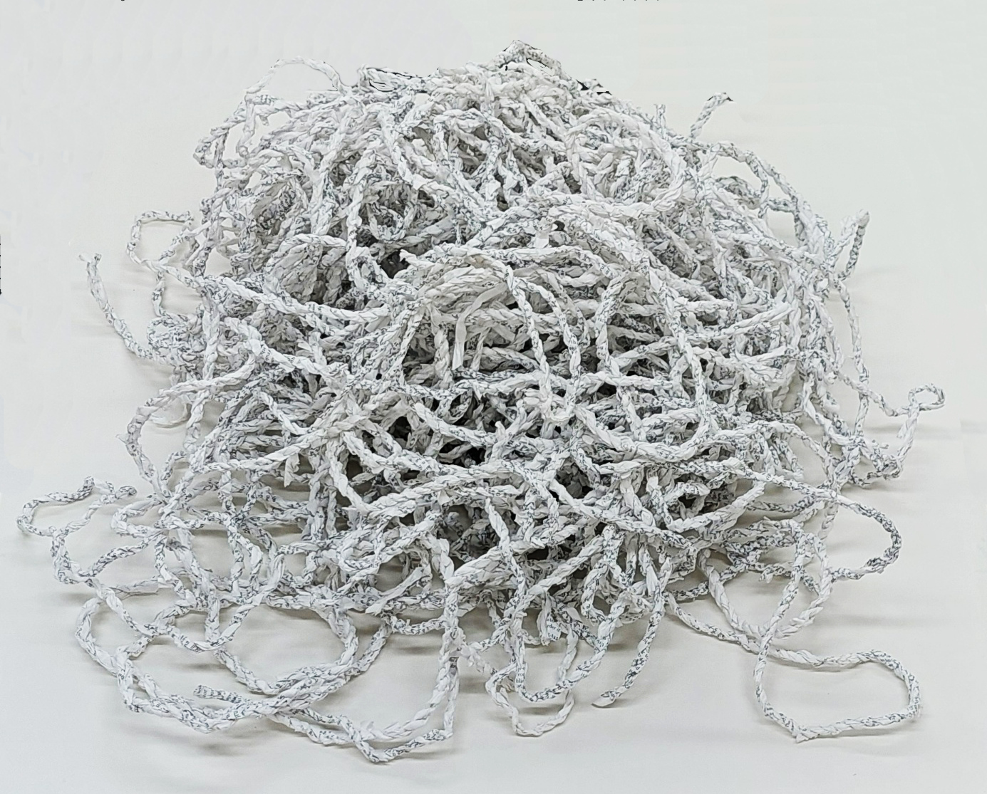 “There is a performative quality embedded in this process. A silent choreography of fingers, wrists, shoulders—the whole body contributing to a rhythm. It recalls the physical, historical act of using our hands to weave a basket or a piece of cloth: a gesture repeated across centuries, continents, and civilizations. The Pile At Her feet harnesses these movements using the restrictive and life threatening outcomes of the Dobbs vs. Jackson Women’s Health decision by weaving the ripped up document into traditional cordage.”