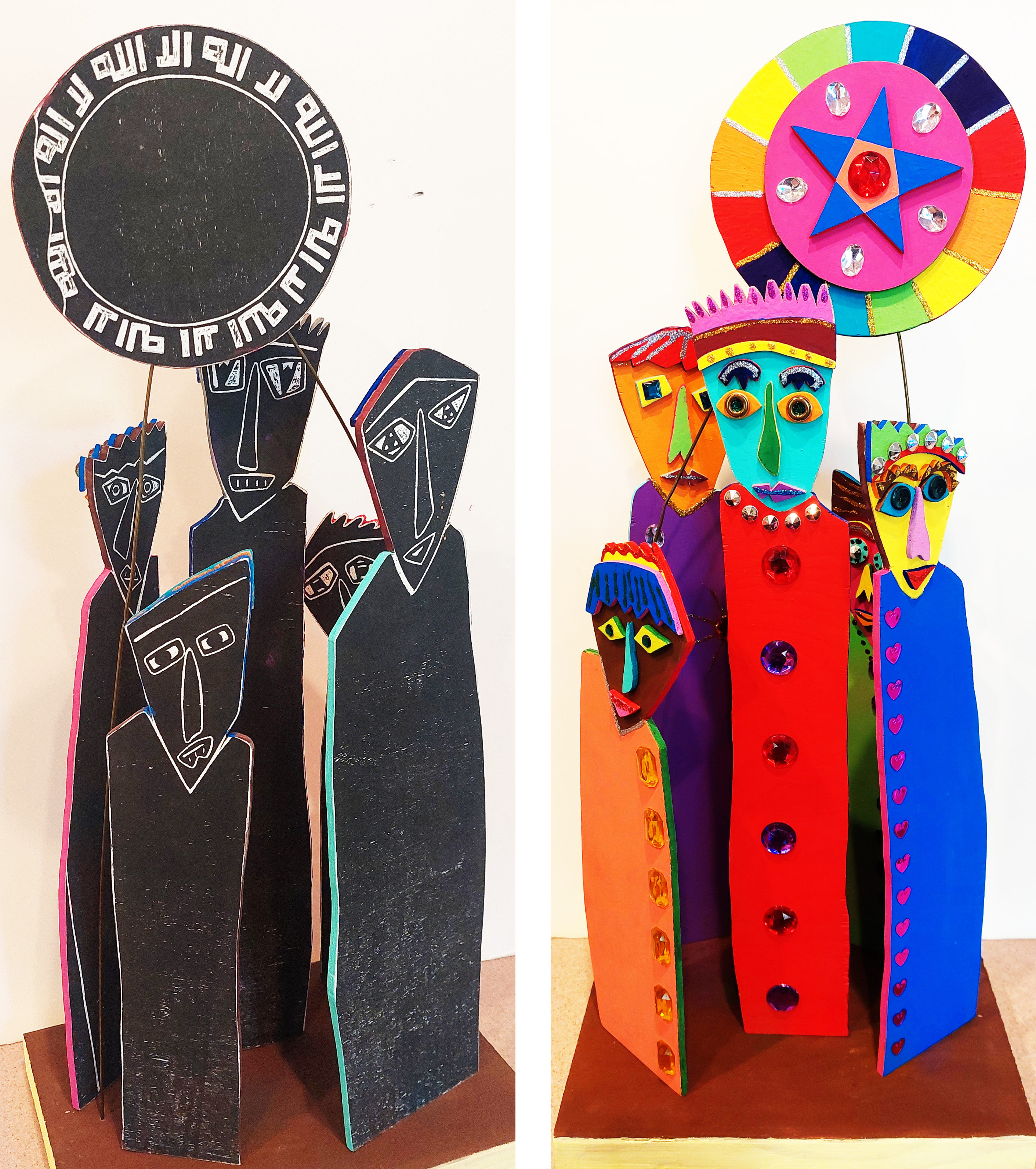 mixed media wood sculpture, based on a woodcut print; 28×12.5×9”
