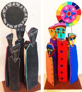 “In our world of violence and injustice and in the current times in the USA, one often feels like a helpless observer, an impotent witness to a course gone astray, to belief values trodden upon, to dominating and destructive violence impossible to control and stop… One feels badly in need of active arms to stop the bullying, the circle of despair… My sculpture on one b and w side shows the helplessness many of us currently feel; but on the other, with emboldened colors, it reminds us of our energy to carry on the fight.”