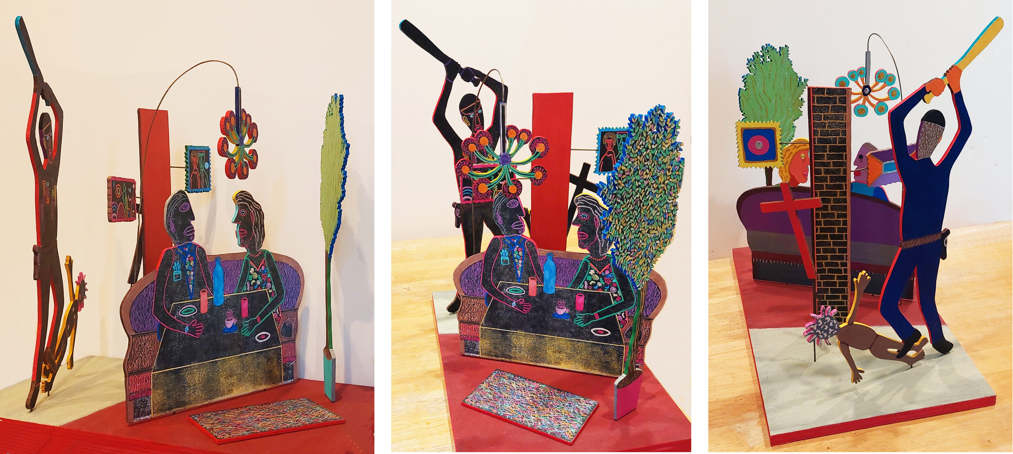 mixed media wood sculpture, based on a woodcut print; 21x21x13”