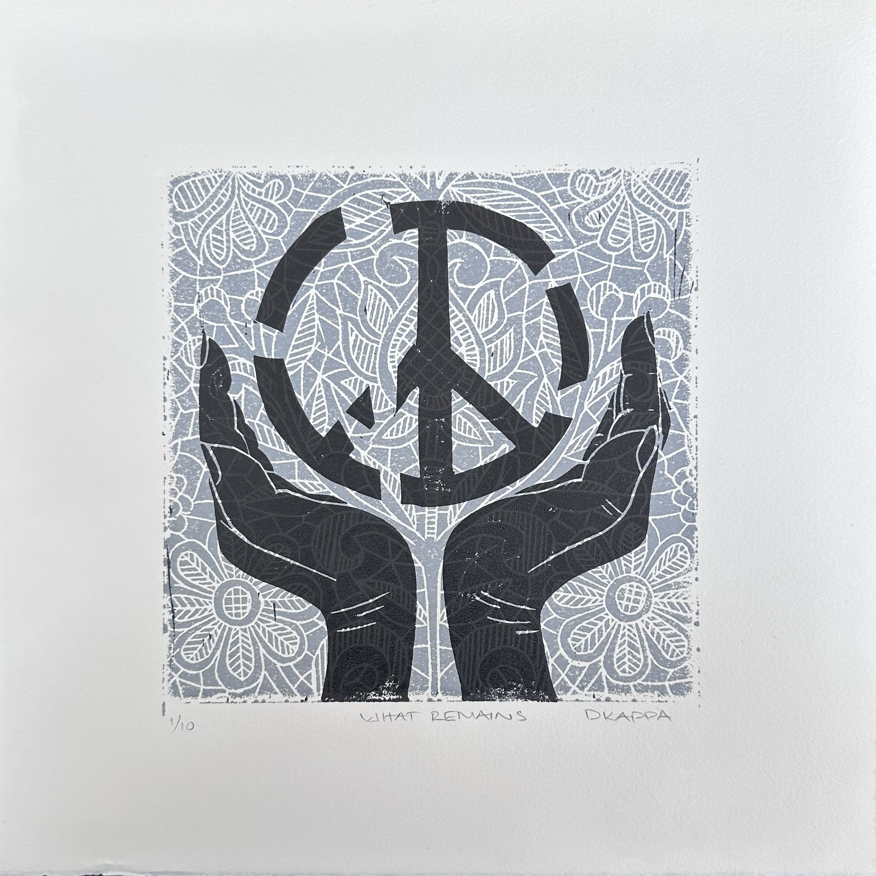 “What Remains explores the aftermath of broken peace. Cradled with care, the shattered symbol symbolizes the burden of loss and the responsibility to rebuild.”