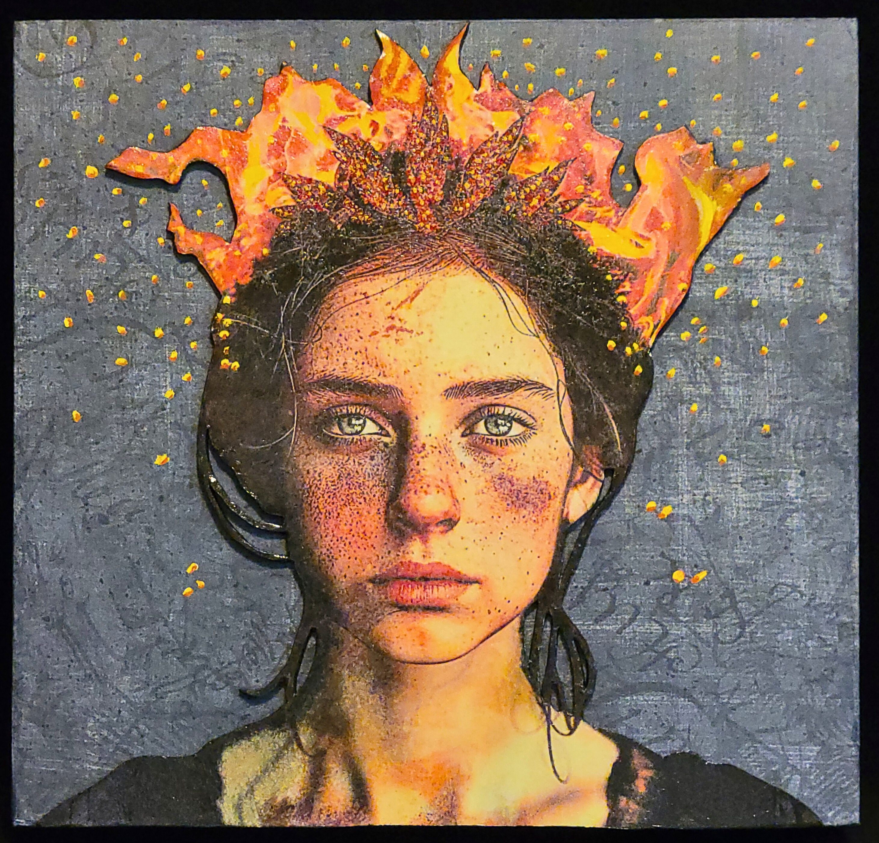 The image was created using AI, printed on water soluble paper, and transferred to polymer clay. The clay image and background were hand painted for enhancement.