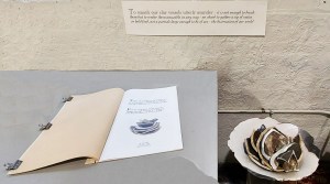 broken clay fragments, book of mourning (Japanese stb binding), 11×17” poster; 9”w x 9”d x 7”h pottery, 18×12”