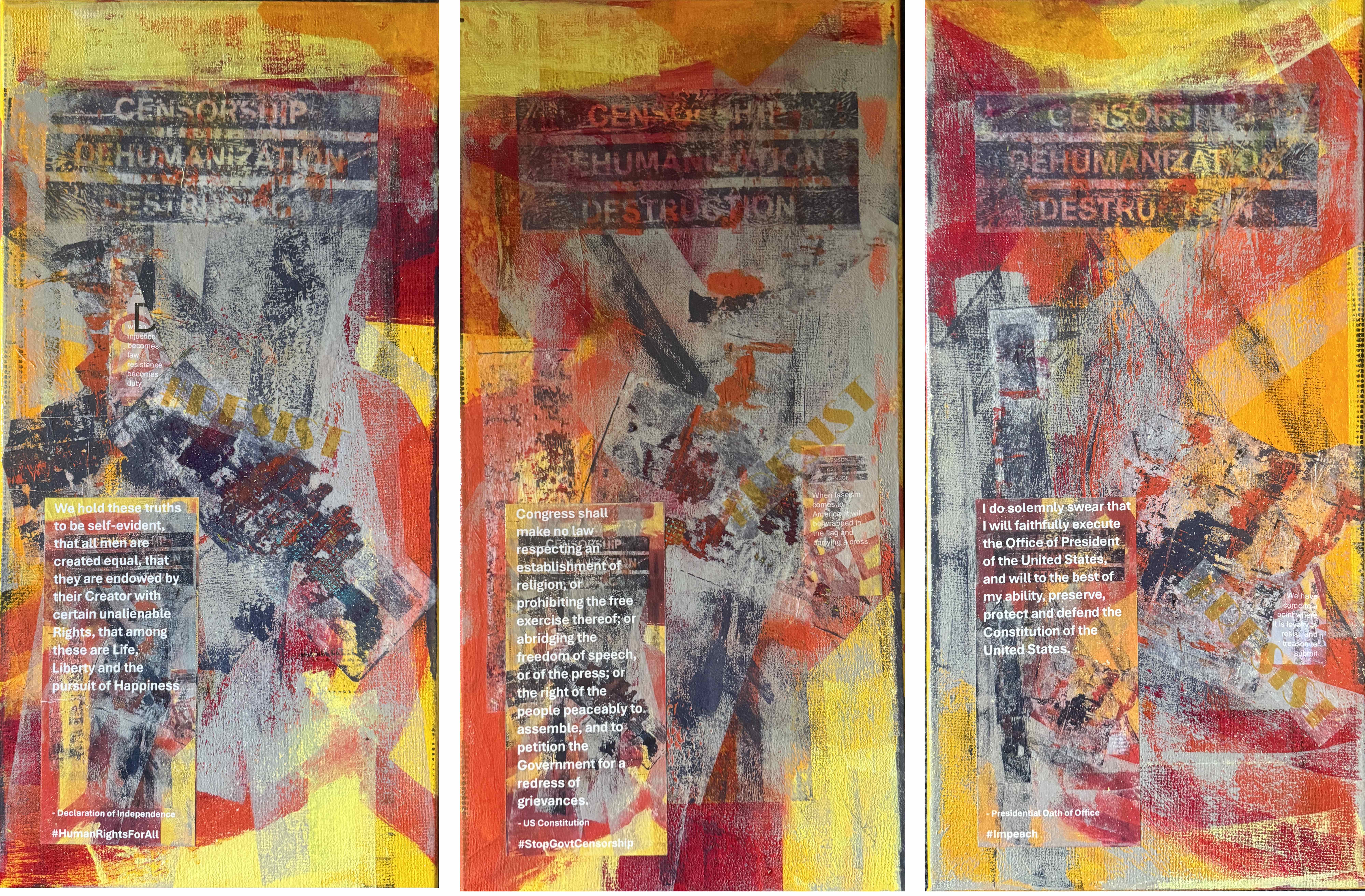 The 1st panel speaks to censorship, the silencing of voices, the rewriting of history, and the denial of truth. Anchored in the First Amendment, its urgent call to action is to defend the right to speak, to question, and to dissent.