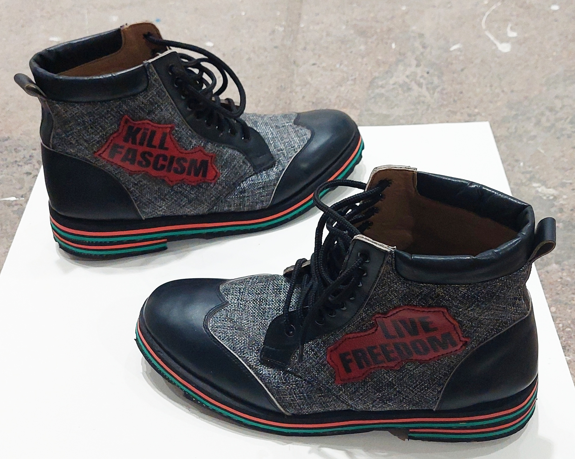 ARTIST BIO: Jamey Ponte and Peter Opiyo collaborate on bring a boot to Fascism. Jamey, a known activist and artist living in Cincinnati, Ohio as well as Nairobi, Kenya, is a founder of East Africa’s only Arts District, known as the Kibera Arts District. Most of his work is heavily artivism on issues of wildlife, environment and social justice. Jamey sees himself mostly today as a Social Practice Art. Peter- a resident of the Kibera Arts District and leader of Moya Footwear has collaborated with Jamey on a number of customized shoes for the sole purpose of art and some for more fashionable functional wares.
