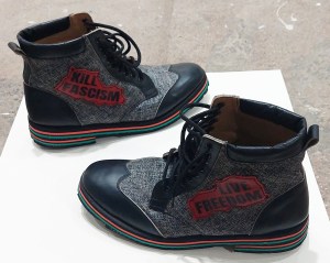 “The current crisis/era of the USA has weighed on us all and I (Jamey -USA/Kenya) even while in Kenya have not escaped how sad the USA has become. On my journey coming back for a few months to the USA I wanted to enter the country with a stand. The idea was to make a boot to kick FASCISM dead. I wore these into the country getting off the plane through the US customs and yes I got some remarks but not detained. We all must take a stand and Peter (Kenya) heard my conversations and disgust of what is happening in my home country and we discussed and came up with the idea together.”