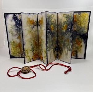 ARTIST BIO: For 48 years, Margaret Rhein has been making paper by hand at her studio, Terrapin Paper Mill in Cincinnati, Ohio, experimenting with a variety of fibers, shapes, colors and textures in 2D & 3D approaches. Her paper collages have been exhibited in galleries and craft shows throughout the country. Margaret has taught workshops in papermaking and related book arts to adults and children. Currently she is exploring Eco Dyeing on various papers using plants, leaves from her gardens.