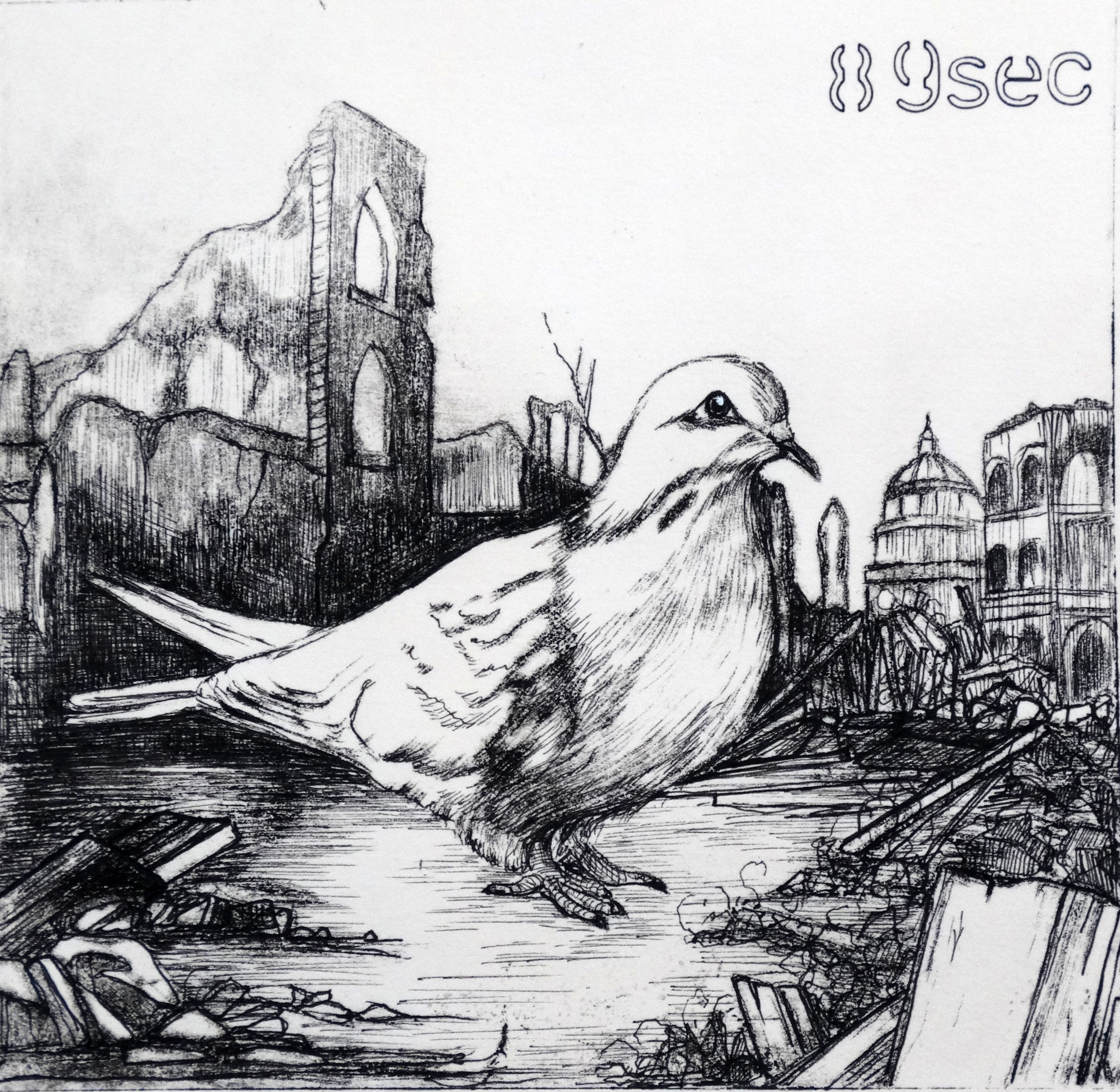 “’Ultima Prex Ante Noctem’ presents a lone dove perched amid the crumbling ruins of a city as a visual meditation on the tension between destruction and hope. The ruined cityscape symbolizes the consequences of humanity’s choices—war, climate change, and moral neglect—while the dove stands as a fragile but persistent symbol of peace and divine promise. Included is the current timing of the Doomsday Clock, aimed to confront the viewer with urgency while offering a glimpse of redemption, reflecting the belief that even in the darkest moments, peace is not beyond reach, but it requires intentional action before time runs out.”
