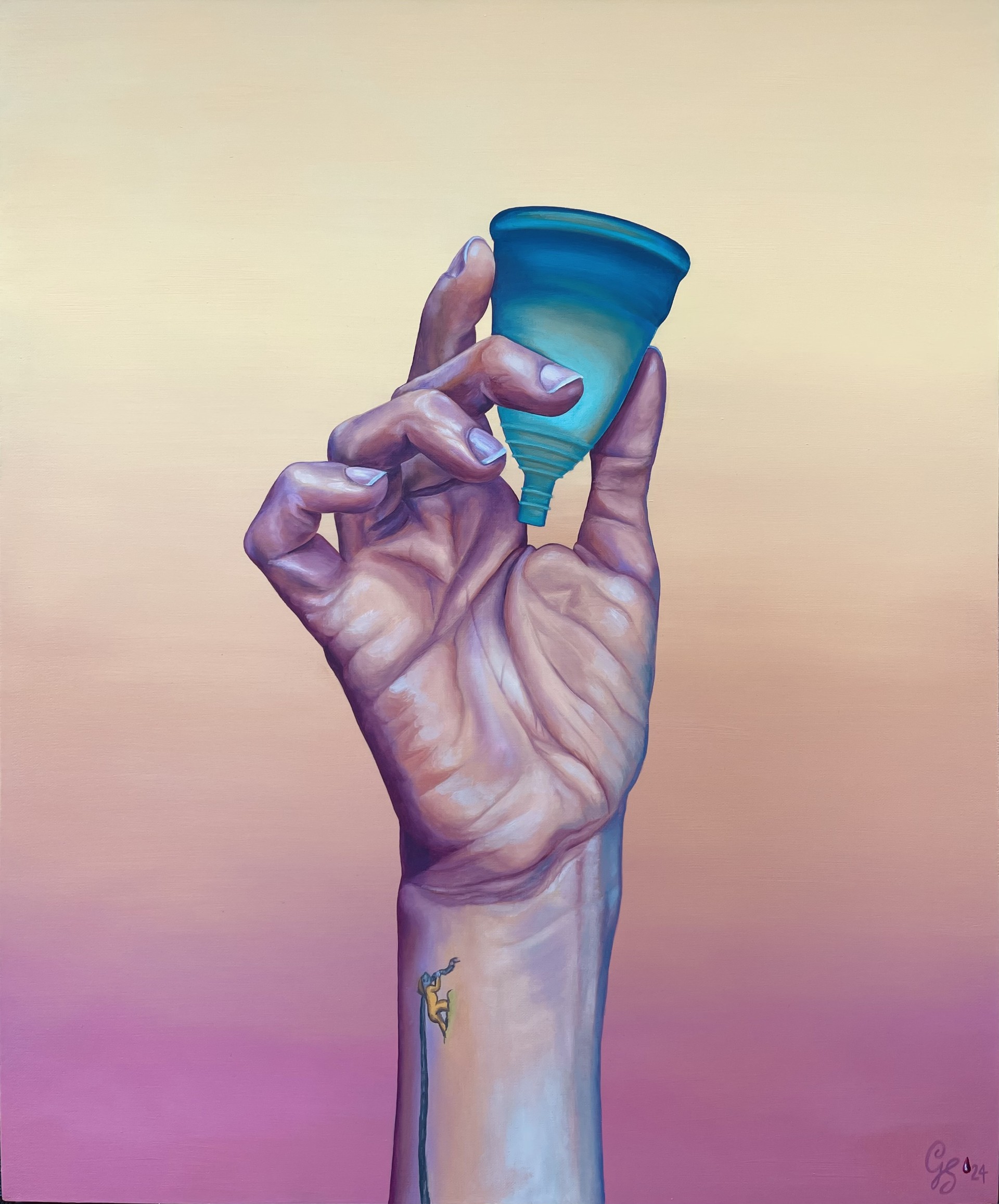 “A single, simple change can have a profound and lasting effect. While the cotton or rayon portion of a tampon is used for just a few hours, the plastic applicator and wrapper can persist in the environment for hundreds of years. Over the course of a lifetime, the average woman may use up to 17,000 tampons—resulting in more than 50,000 individual pieces of plastic waste from just one person. This artwork’s title grows each month, symbolizing the number of plastic pieces I’ve avoided contributing to landfills and oceans since making the switch to a menstrual cup. Recent studies have also revealed that many mainstream tampon brands contain harmful chemicals and heavy metals, raising serious concerns about their long-term impact on women’s health. Making the switch has not only significantly reduced my environmental footprint, but it has also supported my overall well-being.”