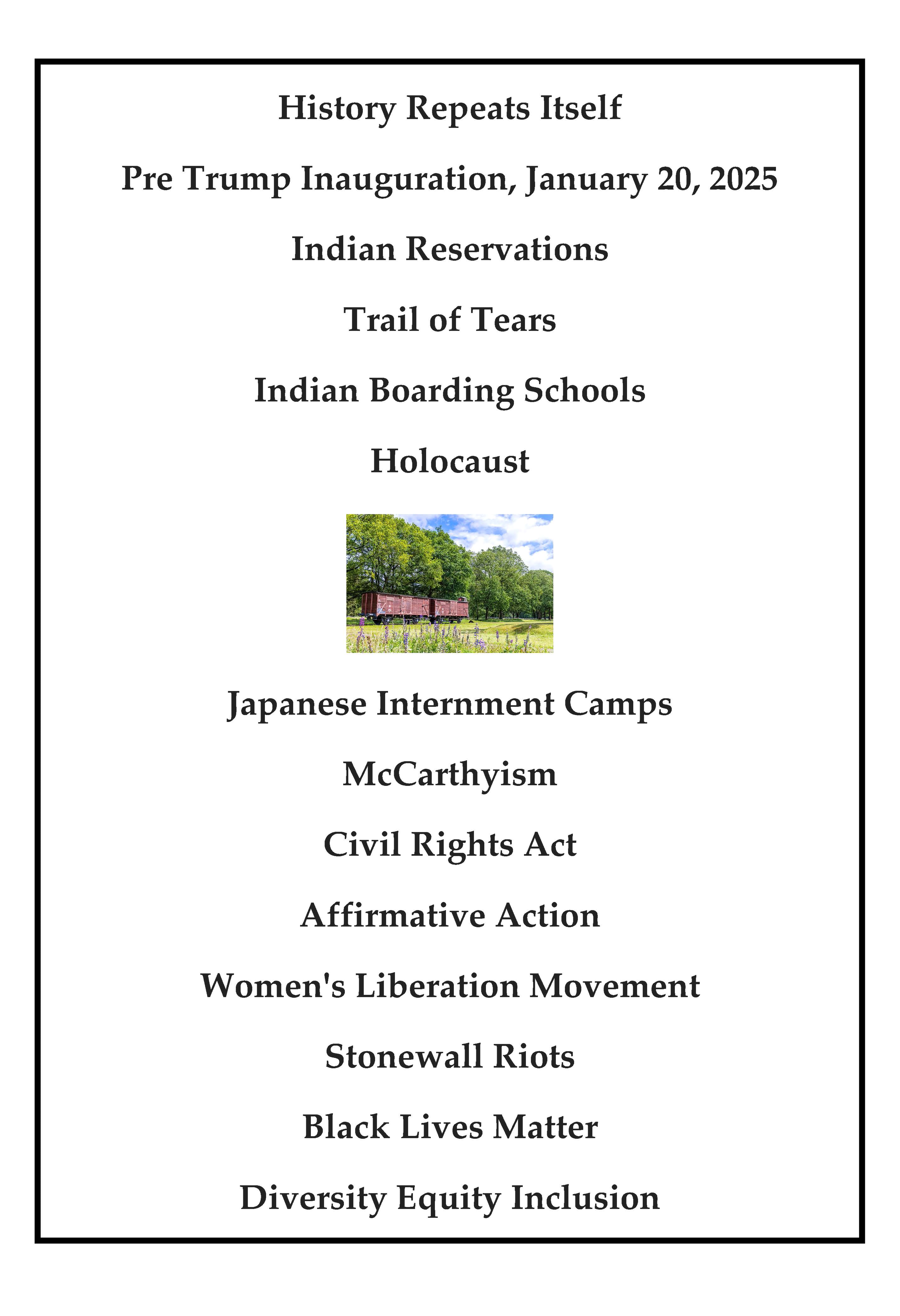 “My artwork incorporates titles of social justice events that affected the United States before Trump’s inauguration on January 20, 2025; also a picture of the wagon train that transported Jews to Auschwitz Birkenau.”