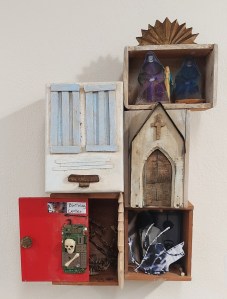 assemblage of 5 boxes, paint, metal, photos; 18x15x5”