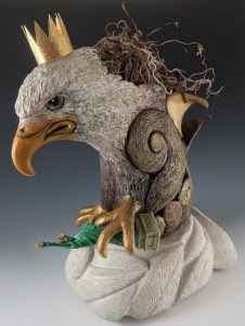 “‘Equal Justice Under the Claw’ critiques power and the erosion of justice in America. Its oversized head reflects Trump’s inflated ego, while gold-touched wings suggest his excess. A flimsy paper crown symbolizes unstable, imagined kingship. Gripped in its talons, Lady Liberty, once a beacon of freedom, appears imperiled, representing the erosion of American ideals. The piece warns how justice—and the promise of justice—falters when authority is driven by vanity instead of compassion.”