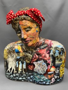 earthenware clay, collage materials, fabric; 17x15x8″