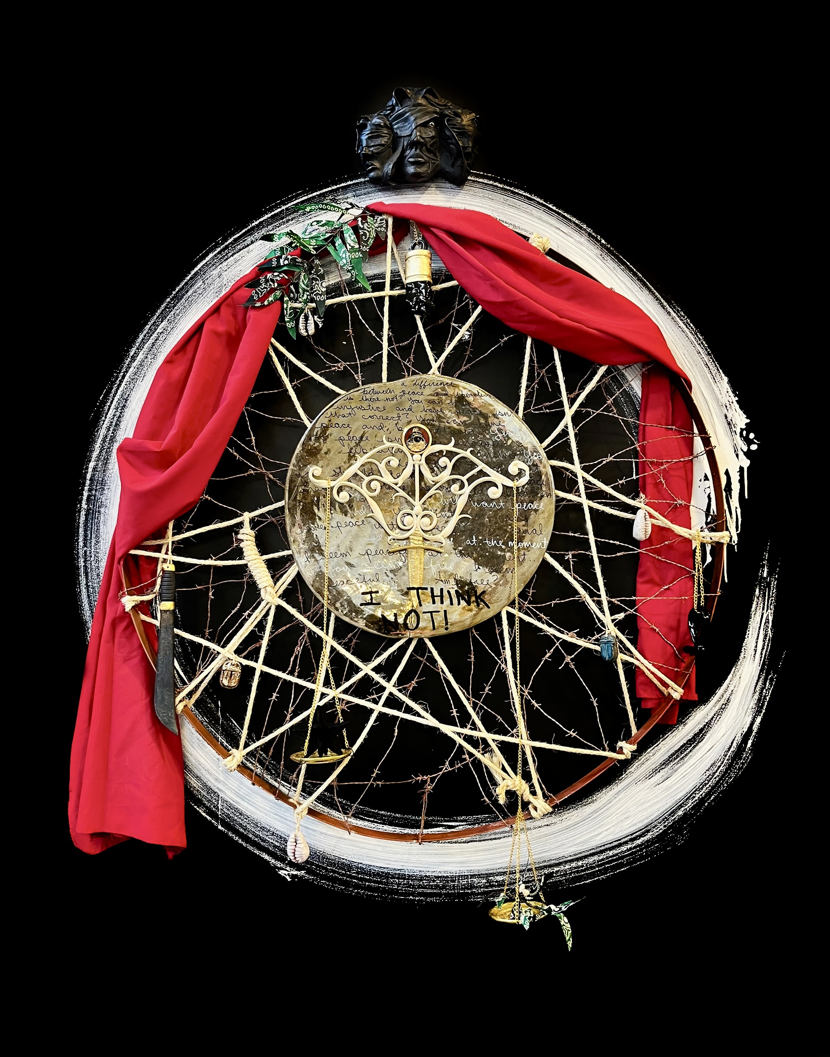 ceramic, found objects, rope, acrylic sheet, chain, bandana scarf, cowrie shells, wire, textile, barbed wire, interior house paint, metal leaf, paint markers, heat-activated chrome, glaze; 79x72x6″