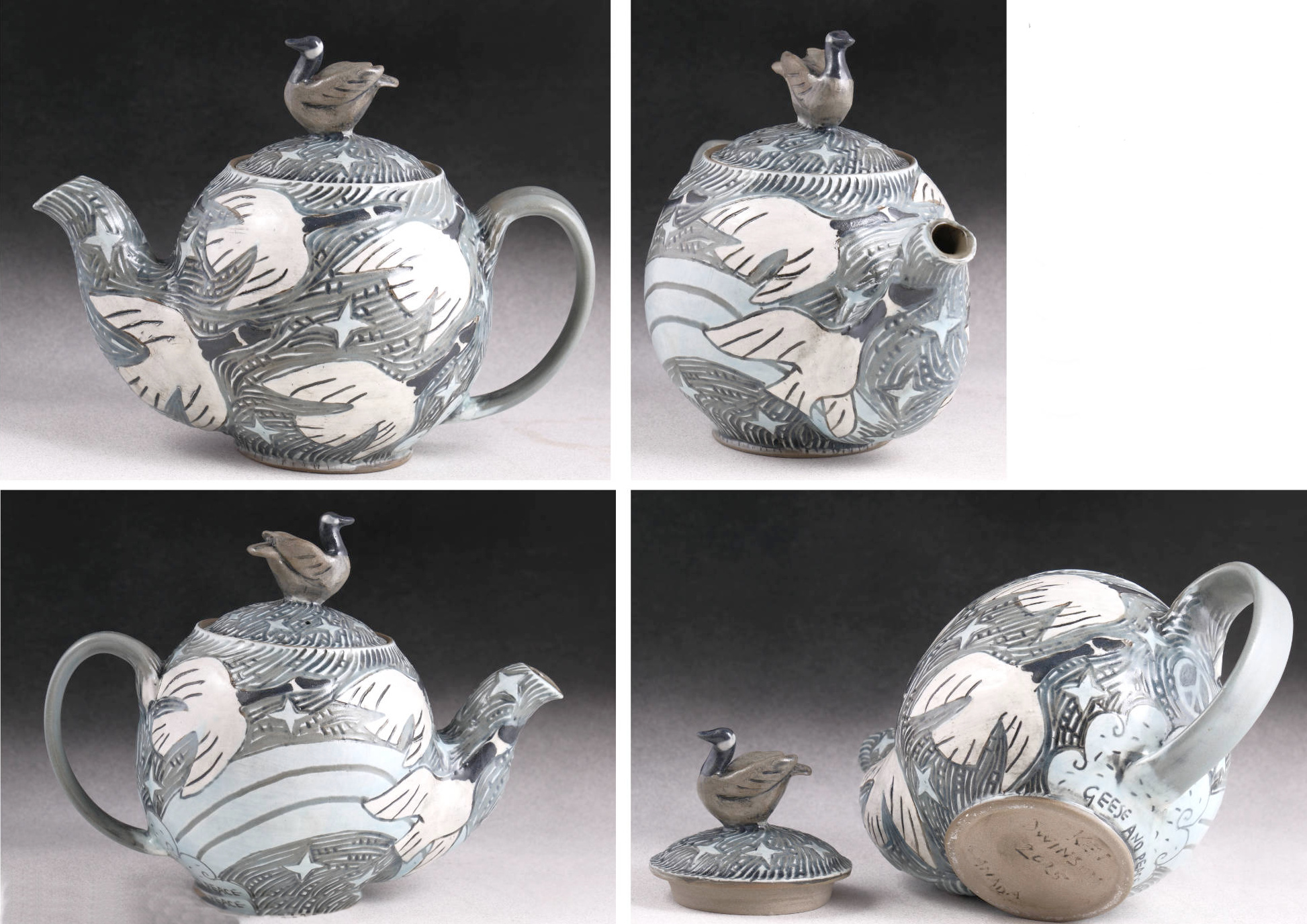 “I was invited to work in a ceramic studio shared by 30 potters in Ontario, Canada. While working with my new pottery friends, I created this teapot as a symbol of goodwill and friendship. I made a second, matching teapot, which was left as a gift to the potters at the studio. Canada Geese fly freely back and forth between our countries and made the perfect mascot for this project.”