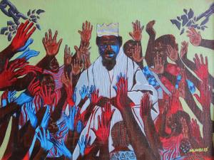 “A sea of hands rises towards a central figure, symbolizing power and recognition that emerge from the people. The broken chains represent liberation and peace, while the reds and blues evoke, both struggle and renewal.”