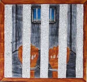 “This artwork speaks to the silent prisons created by systems of social injustice. The bars of this cell are not made of iron, but of words representing oppressive narratives. This means that not all people in prison are guilty.”