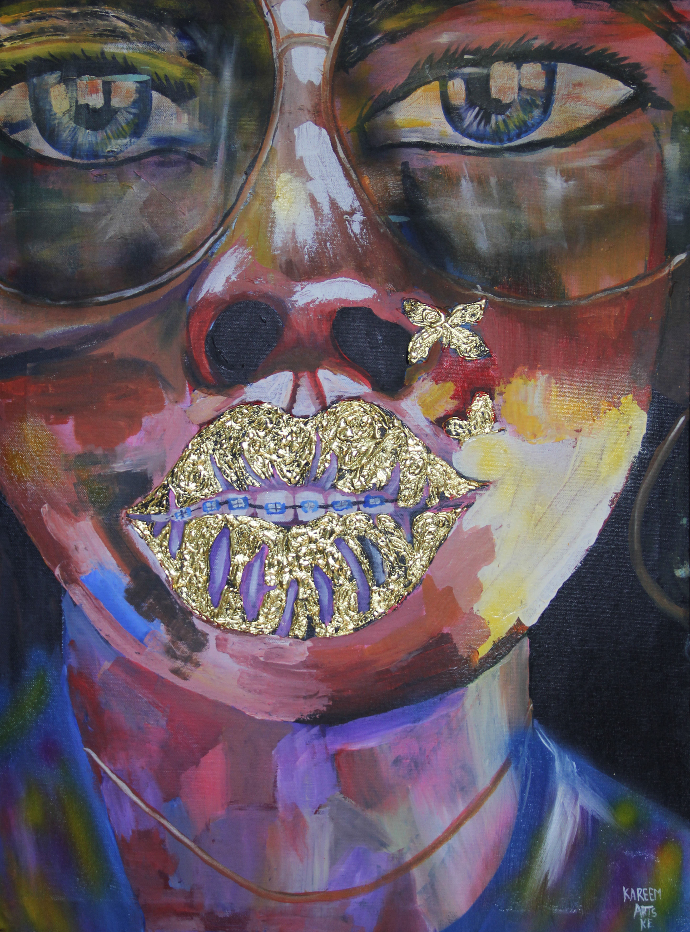 “A portrait of a woman face symbolizing motherhood and people. Reflection of struggle or resilience. Gold lips represent wealth, power, and high status. When applied to lips it also suggests a voice is silenced by wealth and corruption in Kenyan politics. Butterflies symbolize transformation, freedom and new beginnings.”