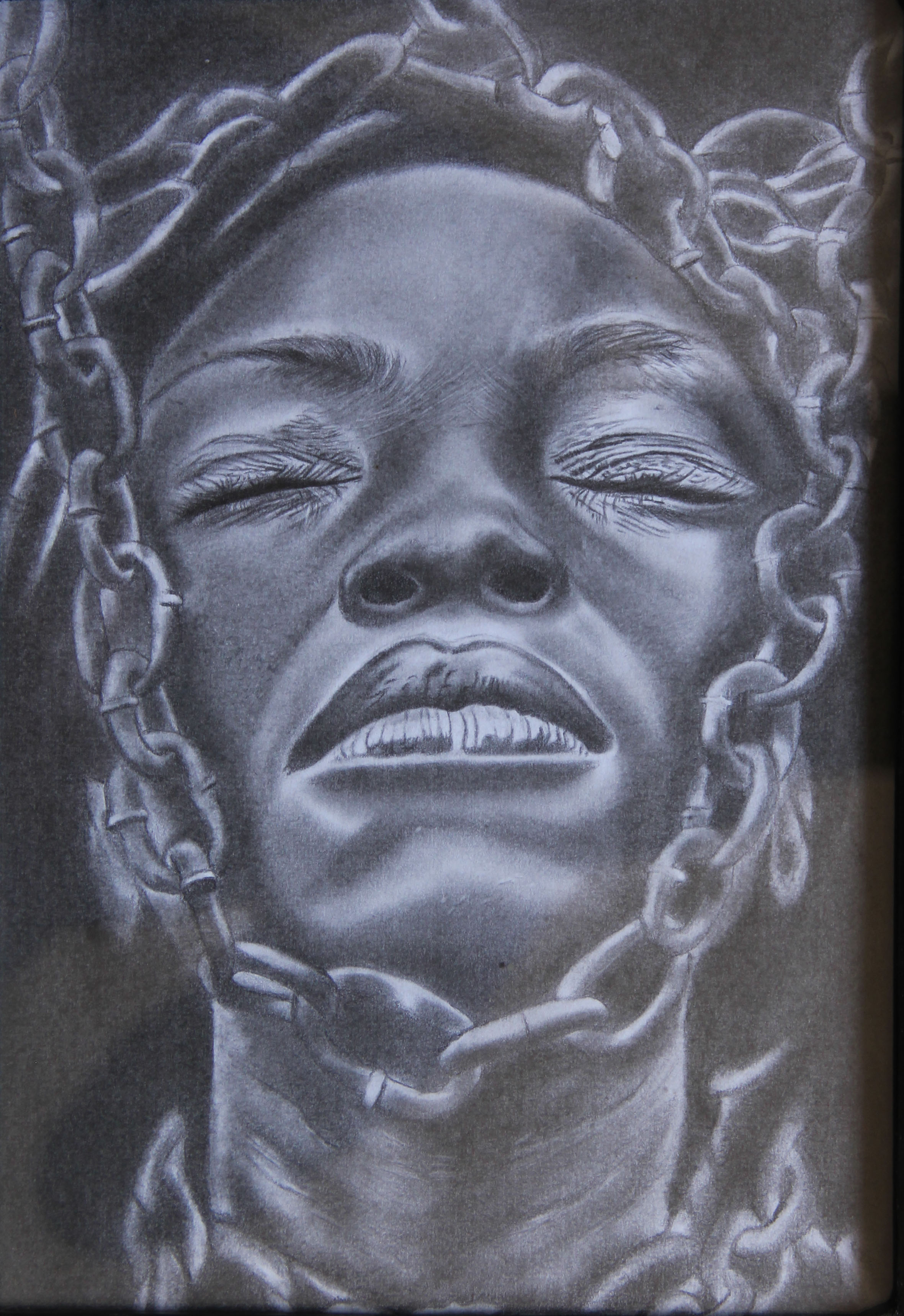 “While bound in chains and lifting her face- the struggles silenced by the layers of oppression. Closed eyes speak of the deep pain, but there is resilience with her. The artist calls for justice- reminding the viewer that beneath the silence lies one searching for freedom, dignity and to be recognized.”