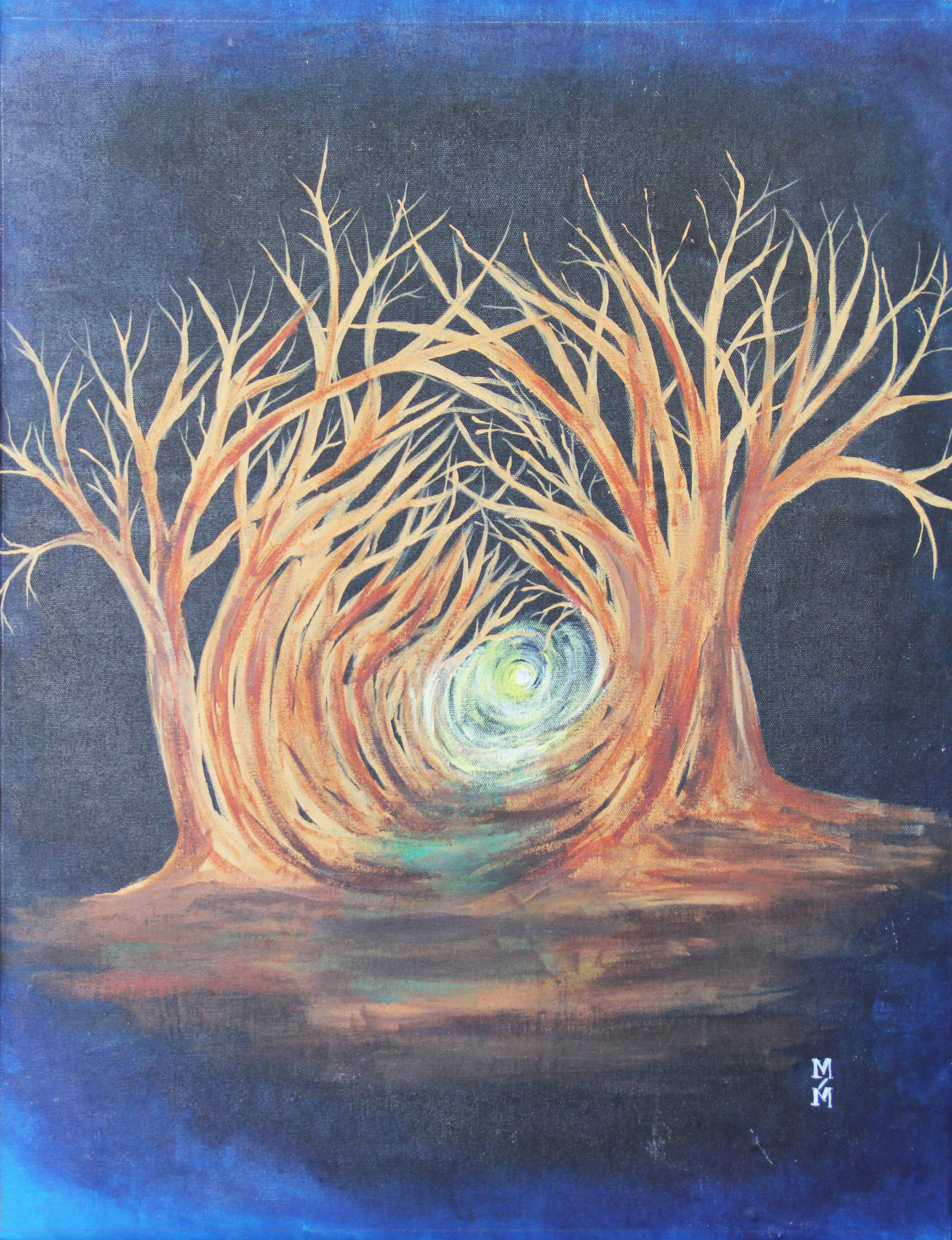 “My piece reflects the struggle of souls caught in tangled systems of injustice. The tunnel of bare trees closes in symbolizing oppression and confinement, yet there is light at the end.”