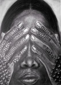 “When justice is withheld- vision is stolen. Showing how power can blind communities. Not seeing the full extent of violence and loss. Hands over her eyes are more than external forces, it also reflects silence imposed by fear. We are too scared of the repercussions to speak out.”