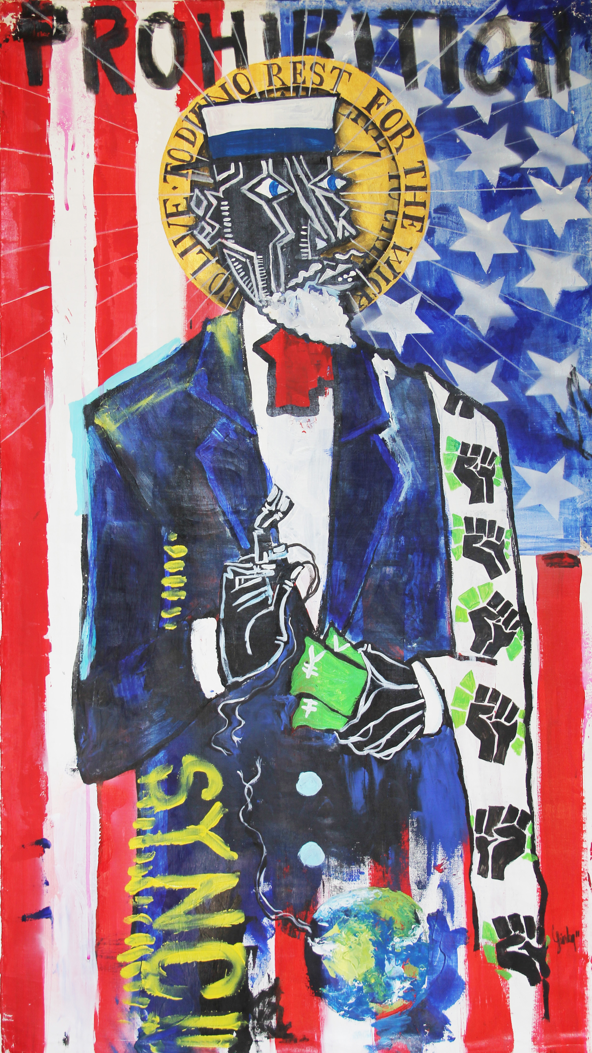 acrylic, oil, aerosol and aqueous acrylic paint, xylol ink on canvas, 125x70cm
