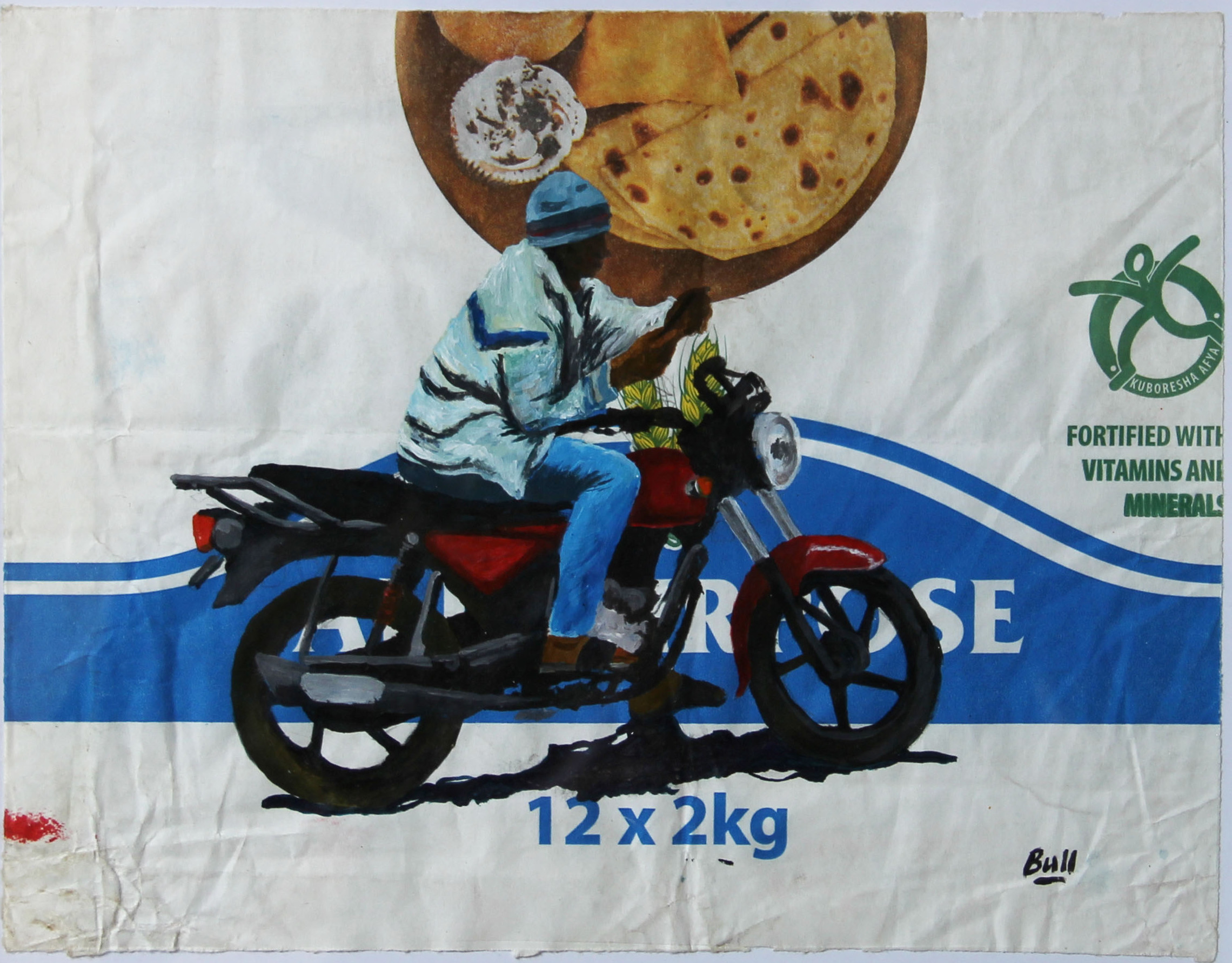 ARTIST BIO: Dennis Ndegwa (Bull) is a visual artist based in Nairobi, Kenya. His practice is rooted in capturing the rhythms, resilience and resourcefulness of everyday Kenyan life. His art echoes both the vibrancy and grit of his surroundings. For instance he draws inspiration from bodabodas, using them as symbolic vessels for Kenya’s economic shifts, urban motion and the relentless grit of its people as they hustle for their daily bread or ‘kutafuta unga’ as it is called in the streets. He explores themes of survival, innovation and the hustle that defines Kenya’s social and cultural fabric. Bull’s work not only celebrates the hardworking spirit of those around him but also highlights sustainability through use of repurposed materials.