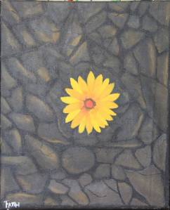 “The yellow flower is a vulnerable soul and last beacon of Hope, tenaciously surviving a deadly crisis. The cracked earth, symbolizes systematic decay and environmental collapse.”
