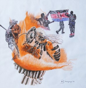 “The bee harmless to the flower, the flag still lifted per the green representing land has turned blue for the police and their system. The orange sharing that nation is burning. The viewer should know the beehive is watching; Leave the bee be!”