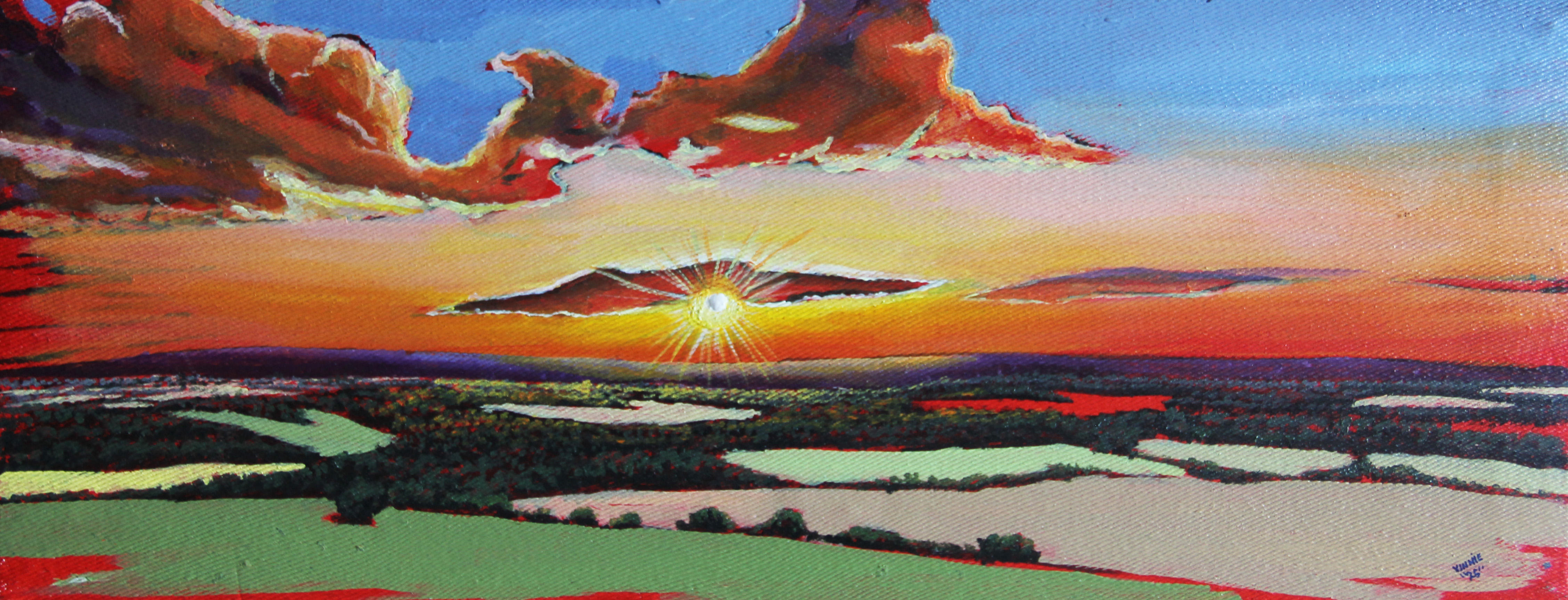 ARTIST BIO: Vincent Kimeu aka Vinnie artist, based in Nairobi, is a member of Mukuru art collective. He does landscape painting to reconnect people with nature and uses red as his background color as it stands for danger, energy, passion, ambition. He uses black to signify mystery and unknown. Vincent is working on a series called Astronomical. It reflects the atmospheric effects of time, the transition from daylight to night, dawn to dusk. Vincent has participated in several exbition, including the Affordable Art exbition, at the Circle Art gallery, the One Off contemporary art gallery, the Heritage Centre in Atlanta, Georgia, the Banana Hill art gallery.