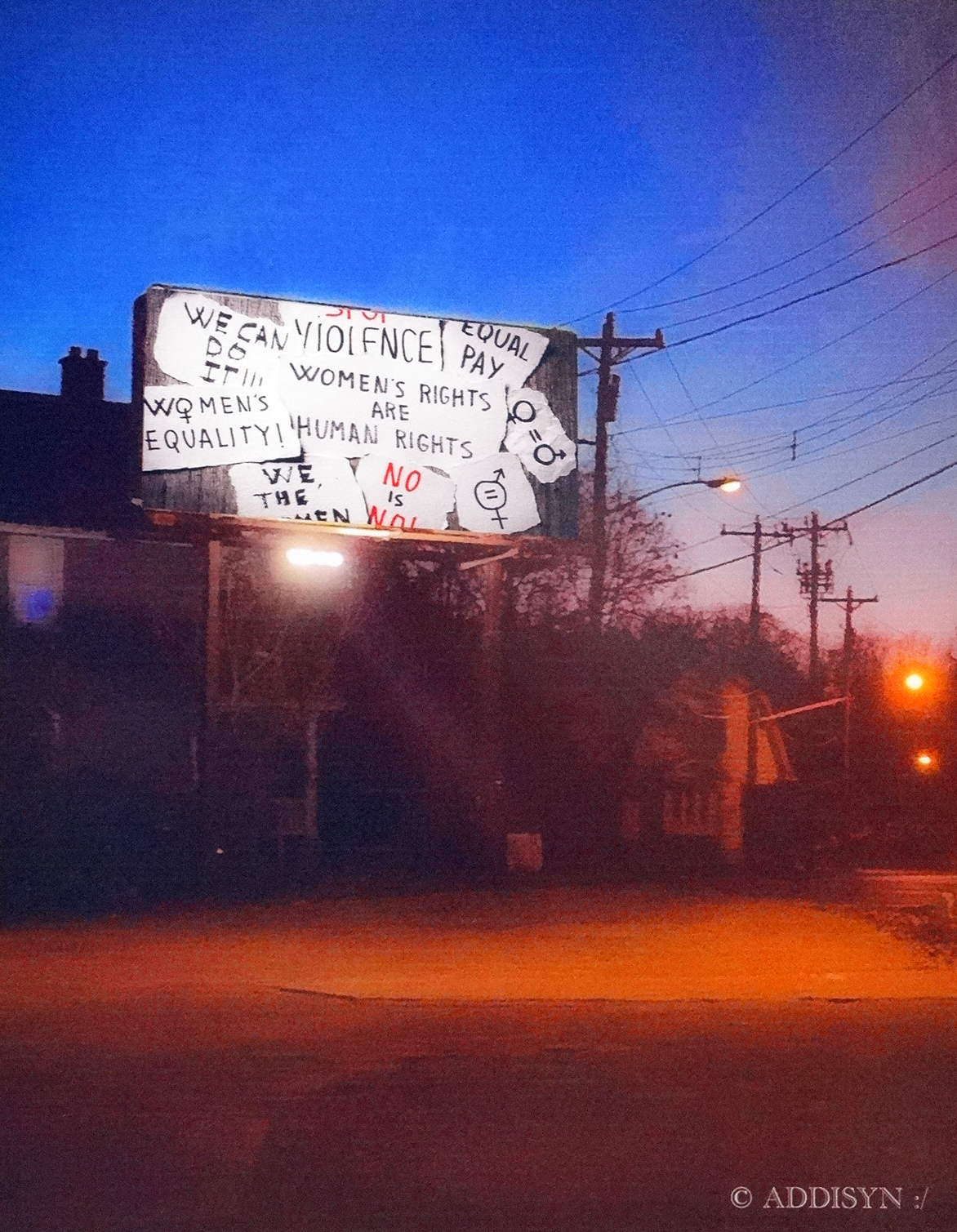 ART PROJECT: “Inspired by the work of Osamu James Nakagawa, Gordon Parks, and others, students, working under the guidance of art teachers Lindsay Holliday and Matt Reed, were asked to shoot a photo of a sign or billboard in a meaningful or familiar place, and then juxtapose onto it an image that they created or appropriated, that addresses an issue of peace or social justice. The students were challenged to consider issues that were meaningful to them and how they might present them in a work of art.”