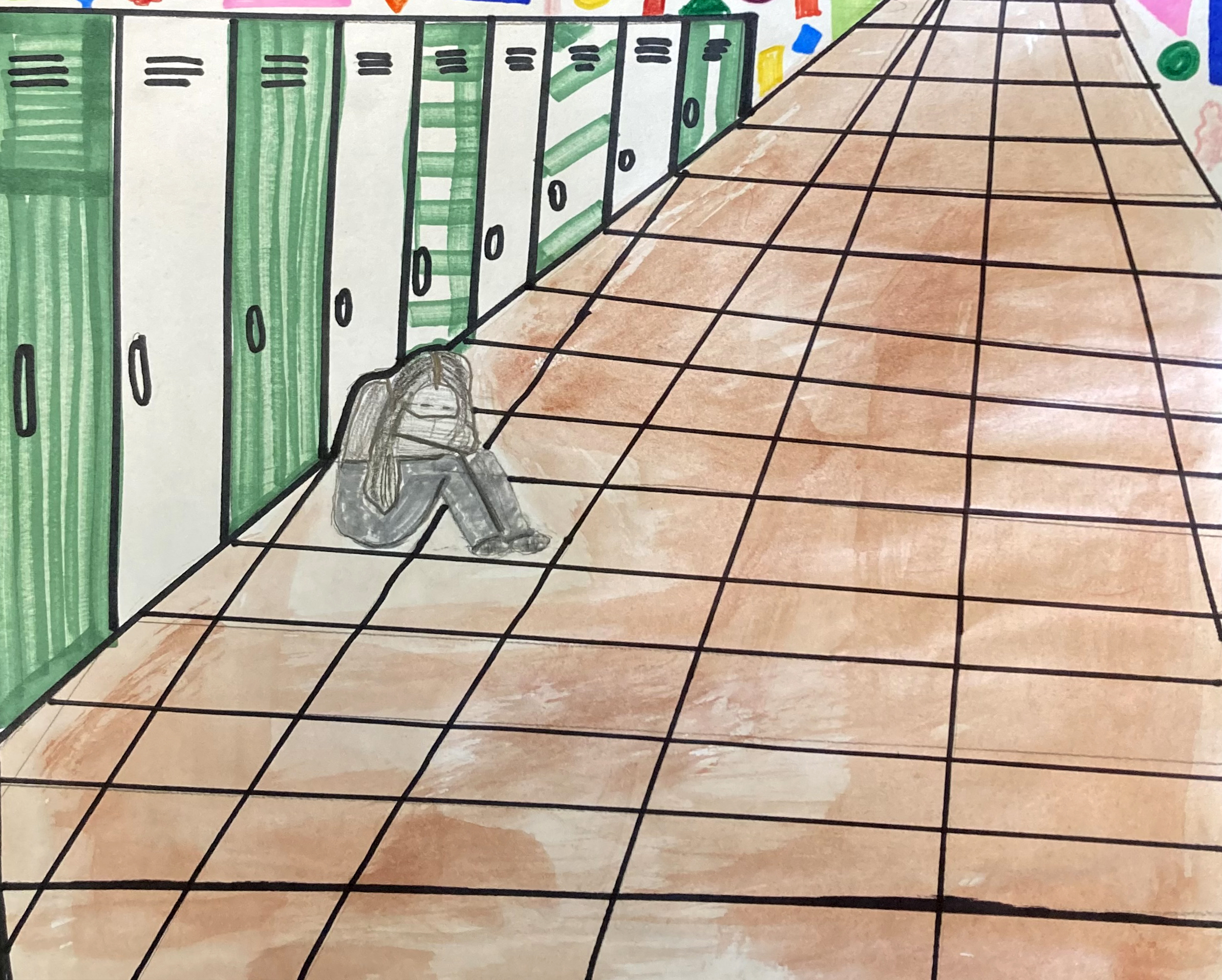 “My piece is about Isolation. It shows a girl sitting alone by her lockers, upset and surrounded by a color full environment reflecting happiness and excitement. The girl feels alone and not comfortable talking to anyone about her isolation, afraid of being judged and bullied. After she gets home and is asked by her parents “How was school today?” she never tells them about her feelings and always answers it was “ok”.”