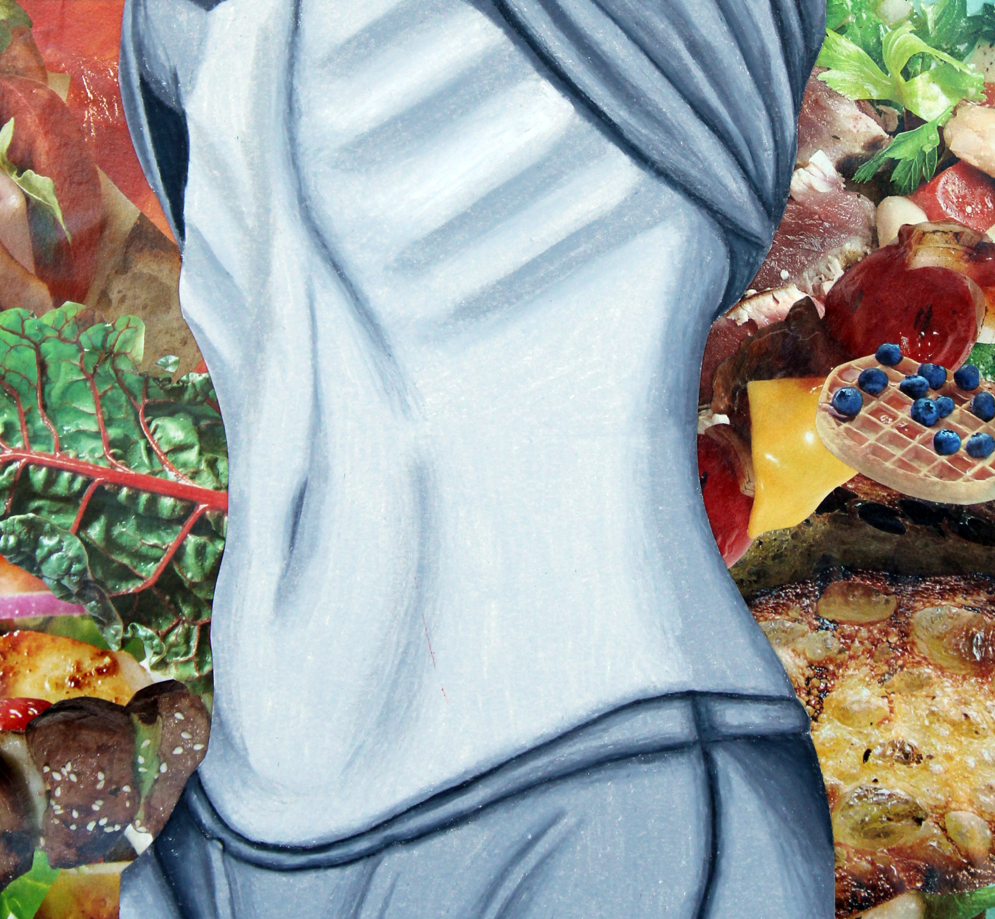 “My piece depicts an unhealthy body. It focuses on comparing your body to others’ to the point where you stop eating. The background shows a collage of food.”