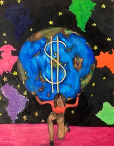 “Children should be able to enjoy their childhood without excessive work at a young age. Many children in the world are not able to live a childhood without being forced into labor to provide for themselves and their family. It is quite common in America and other countries to be forced into child labor. At the beginning of 2020 approximately 63 million girls and 97 million boys were forced into child labor throughout the world. I drew a child on their knees in the night sky holding a big earth. The earth has a dollar sign in it and continents are around it. It was meant to say that child labor can happen anywhere and at any time.”